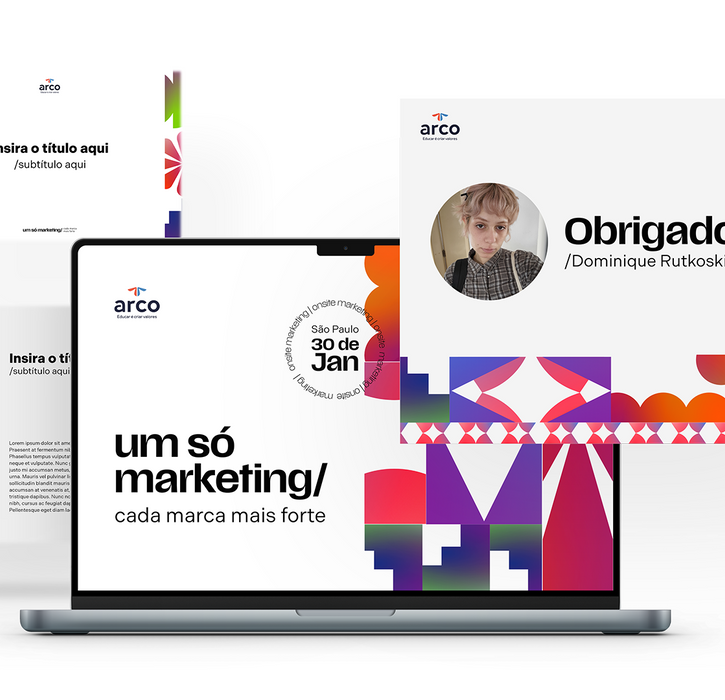 Mais do que uma unificação visual, esta identidade traduz a cultura do time de marketing da Arco Educação. Através de um sistema de formas geométricas, gradientes e sobreposições, criamos novos símbolos onde as seis marcas coexistem. O design conecta as individualidades em um todo coeso, fortalecendo o senso de pertencimento e a liberdade criativa.
